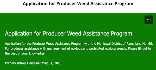 The MD of Ranchland offers funding assistance in the form of rebates to producers wishing to manage regulated weeds on their land. The amount of compensation for weed control depends on the group to which the weed belongs, and priorities identified by MD agriculture staff.